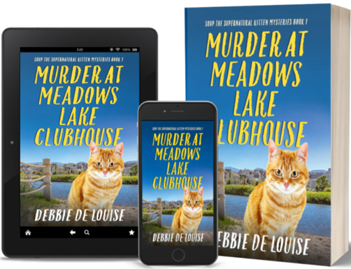 Murder at Meadows Lake Clubhouse is the first book in the new paranormal cozy Soup the Supernatural Kitten Mysteries by veteran (and one of my all-time favorites) author Debbie De Louise. The plot features a recent widow who relocates to an over-55 community in South Carolina and the unusually gifted kitten she discovers in her brand-new home. Convinced to sell the home she shared for more than 30 years with her husband Harvey, Rose Fairchild decides to make a fresh start in a new setting and moves to Meadows Lake, South Carolina. But on her first full day in her new home, she is greeted by the news that there has been a murder in the community’s clubhouse: the victim being the head cook at the restaurant there. She is equally surprised when her new acquaintance, the local sheriff, asks her to accompany him on his rounds to question potential suspects. However, neither of those surprises tops the moment when she discovers her new kitten, Soup, has supernatural abilities and is able to talk!