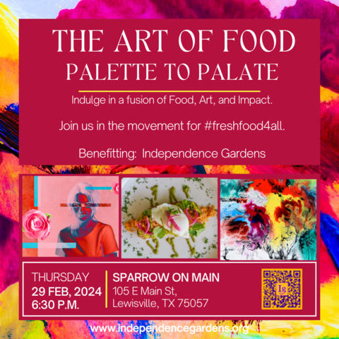 Independence Gardens is delighted to announce "The Art of Food," a culinary event, art show, and auction set to take place on Thursday, February 29, 2024, at Sparrow on Main located in historic Old Town Lewisville. This innovative occasion will seamlessly blend culinary excellence with artistic expression to raise awareness about food insecurity in North Texas and supports Independence Gardens’ programs that provide children in schools and communities access to fresh food.